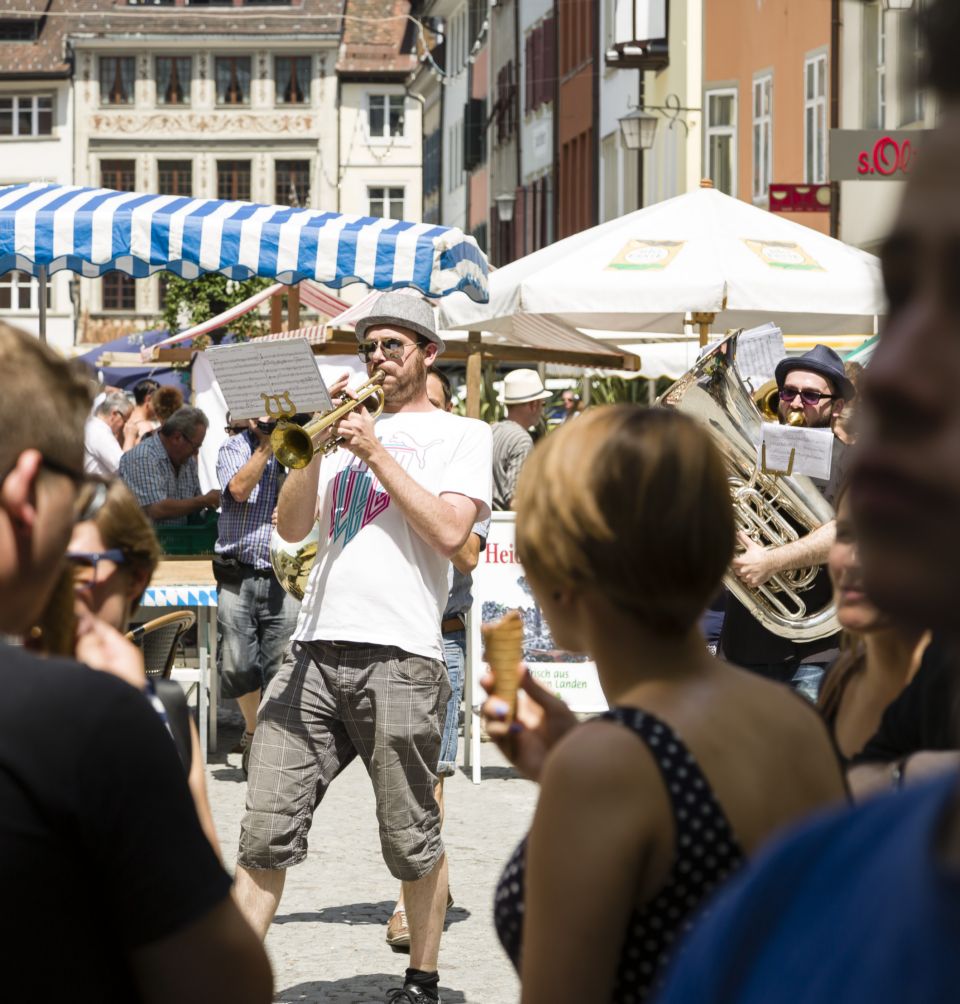Nach einem Konzept von Thomas Ludescher, dem künstlerischen Leiter des SBV in Kooperation mit unserem Musikvermittlungspartner Oliver Hauser und den "Montforter Zwischentönen" wurde die Feldkircher Altstadt zum Schauplatz einer Auseinandersetzung rivalisierender Banden ganz nach dem Motto des Festivals "Streiten zum Glück Konflikt?!". Musiker des Sinfonischen Blasorchesters Vorarlberg - ein Blechbläserquintett, Saxophonquartett, Schlagwerkensemble und Soloeuphonist Bernd Geser im Streit mit Passanten und Schülern haben sich musikalisch duelliert und damit für verwunderte Gesichter der Besucher gesorgt. Anschließend trafen sich die Musikerinnen und Musiker in voller Orchesterbesetzung, nicht wie vorgesehen wegen hohen Temperaturen zu einem Platzkonzert auf dem Leonhardsplatz, sondern im Atrium des Montforthauses. Eine gelungene, etwas andere Art eines Events. Das Orchester mit ihrem Dirigenten Thomas Ludescher und die künstlerischen Leiter des Festivals Folkert Uhde und Hans-Joachim Gögl waren über das Gelingen überglücklich.
